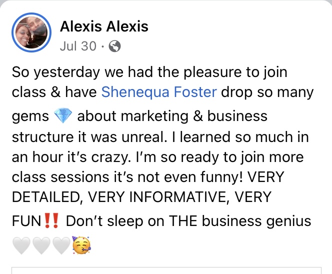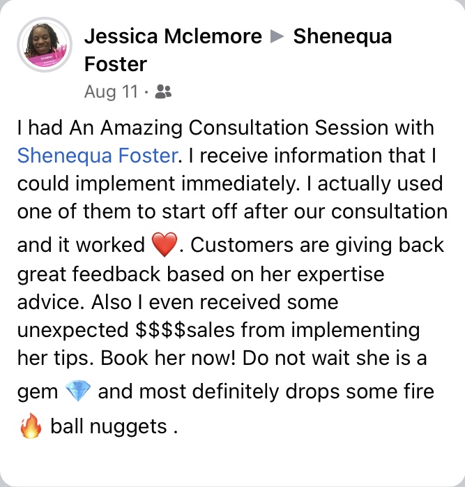 "Shenequa holds a wealth of knowledge and marketing is her goldmine. She has passion and a desire to see you, your team, and your business reach new levels."